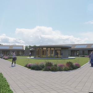 Rondom een gezamenlijk groen hof met paviljoen 14 seniorenwoningen, 8 patiowoningen, 4 starterswoningen en 6 microwoningen
